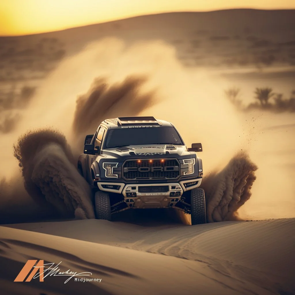 Prompt: photo of a Ford F-150 Raptor racing in a sand dune, sunset, motion, shot on a Sony mirrorless camera, DSLR, 85mm lens f/8, ultra detailed, 8k, --v 4