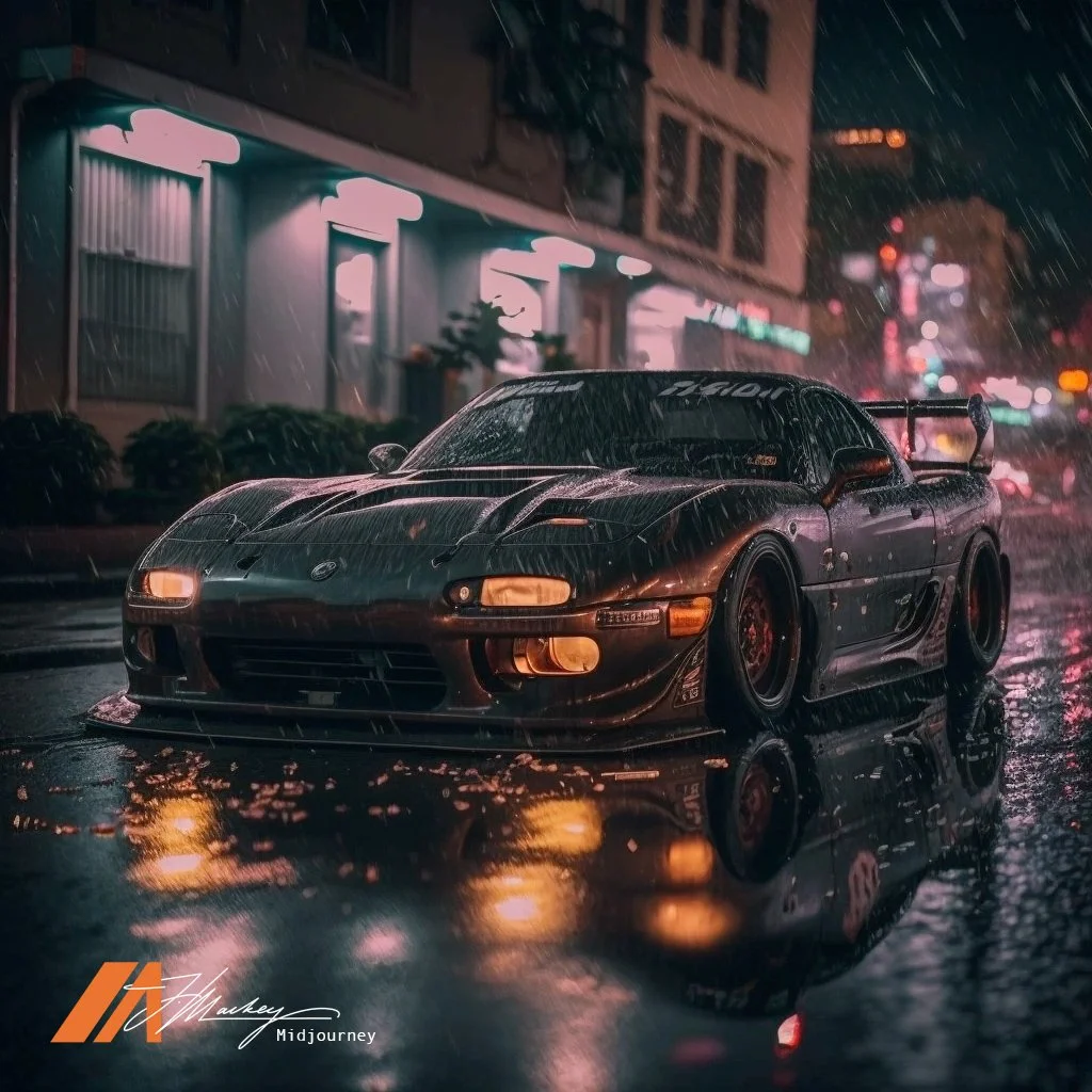 Prompt: a photo of a 90s JDM Mazda RX-7 FD3S at night, neon lights, rain, particles, shot on a Sony mirrorless, DSLR, --v 4