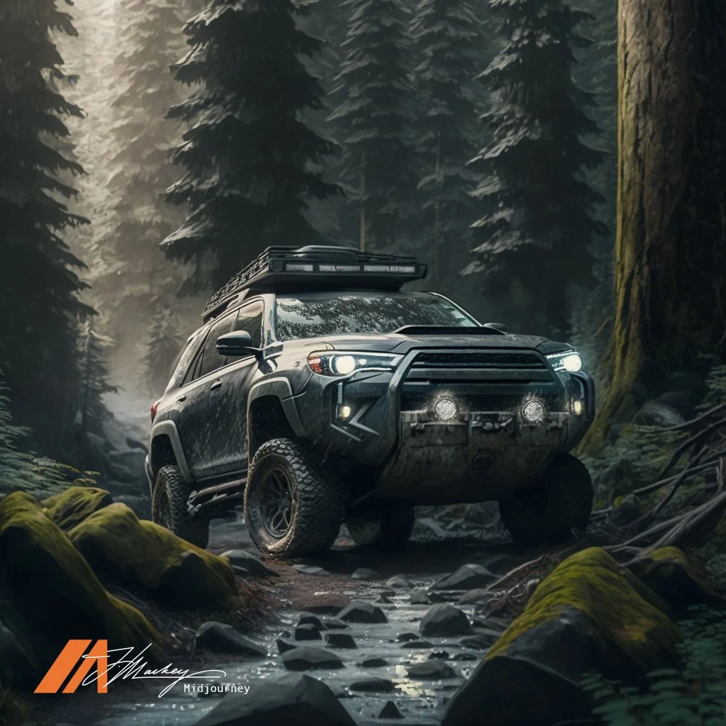 Prompt: black toyota 4runner in the forest, mount rainier, muddy, photography, real, realistic, 8k, bbs, snow, mountains, photorealistic, ultra detailed, --v 4