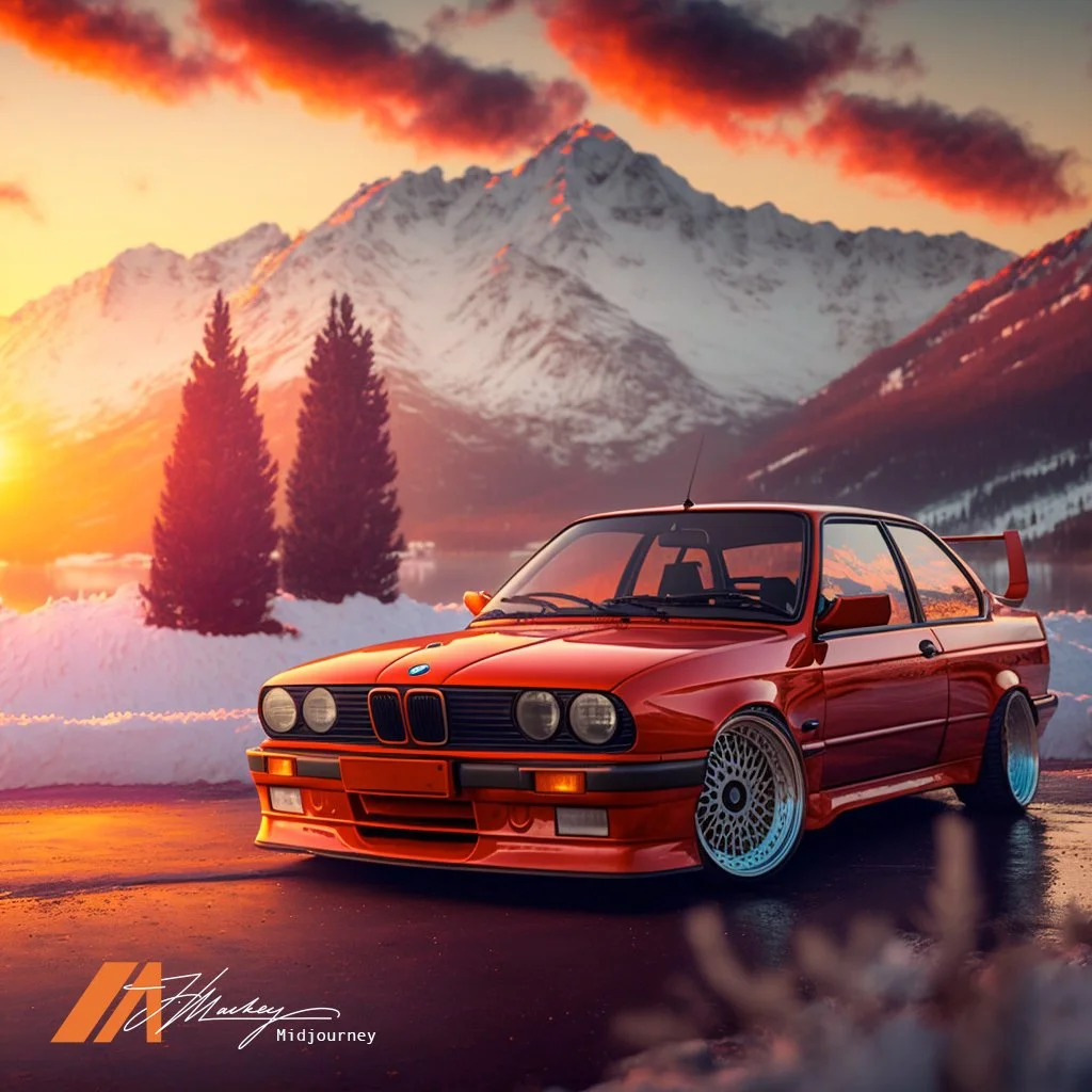 Prompt: red e30 BMW M3 at sunset, photography, real, realistic, 8k, bbs, snow, mountains, photorealistic, ultra detailed, --v 4