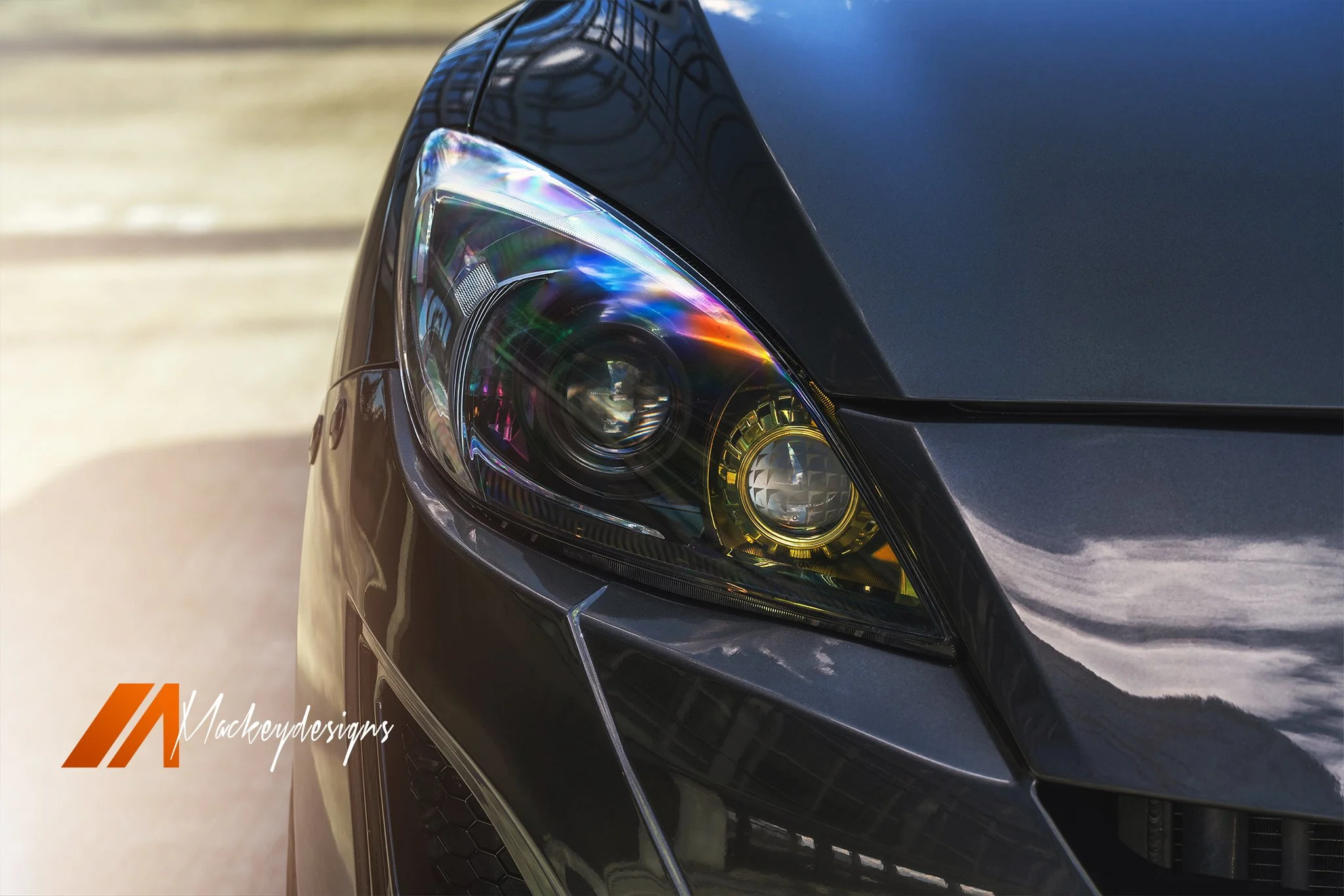 I had a vision (pun intended) to build a set of headlights that not only looked like they came out of the factory, but has the same design elements and functional performance that matched the car. In conjunction with TheRetrofitSource.com, each headlight boasts a pair of both Mini H1 7.0 Prototype projectors and custom bi-xenon projectors with a custom diamond pattern etching. The housing features custom black and metallic yellow paint and the inside also includes carbon covered trim with Mazda3 GT Tech Package clear corner lens markers.